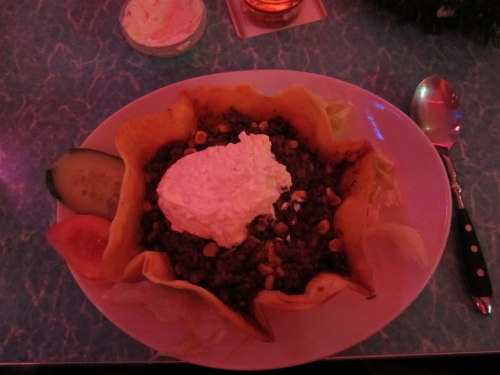 Nach diese interessanten Erfahrung habe ich mich doch noch zu einer “Hauptspeise” überredet. Zur Auswahl standen Potato-Skins mit vier verschiedenen Füllungen (Speck, Chili con Carne, Jalapeno Cheese und Hähnchenbrust) oder eine Portion Chili con carne. Die nette Bedienung hat mich von dem Chili mit der Begründung überzeugt, man könne das Behältnis des Chili essen. Irgendwie schwebte mir daher ein Sourdough-Bread vor, wie man es z.B. In San Francisco des Öfteren als Suppenschüssel bekommt. Statt dessen kommt das Chili in einem Chimichanga.